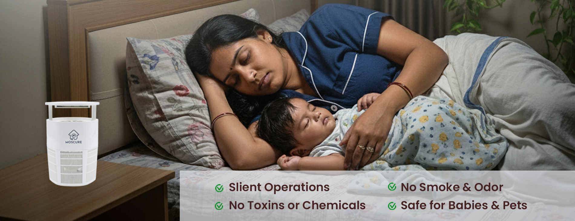 Unlike traditional sprays, coils, or chemical repellents, Moscure is 100% safe for kids, pets, and family members, ensuring comfort and safety. It helps in reducing the spread of mosquito-borne diseases like Zika Virus, Dengue, Malaria, and Chikungunya, making it more than just a comfort product – it’s a health essential.